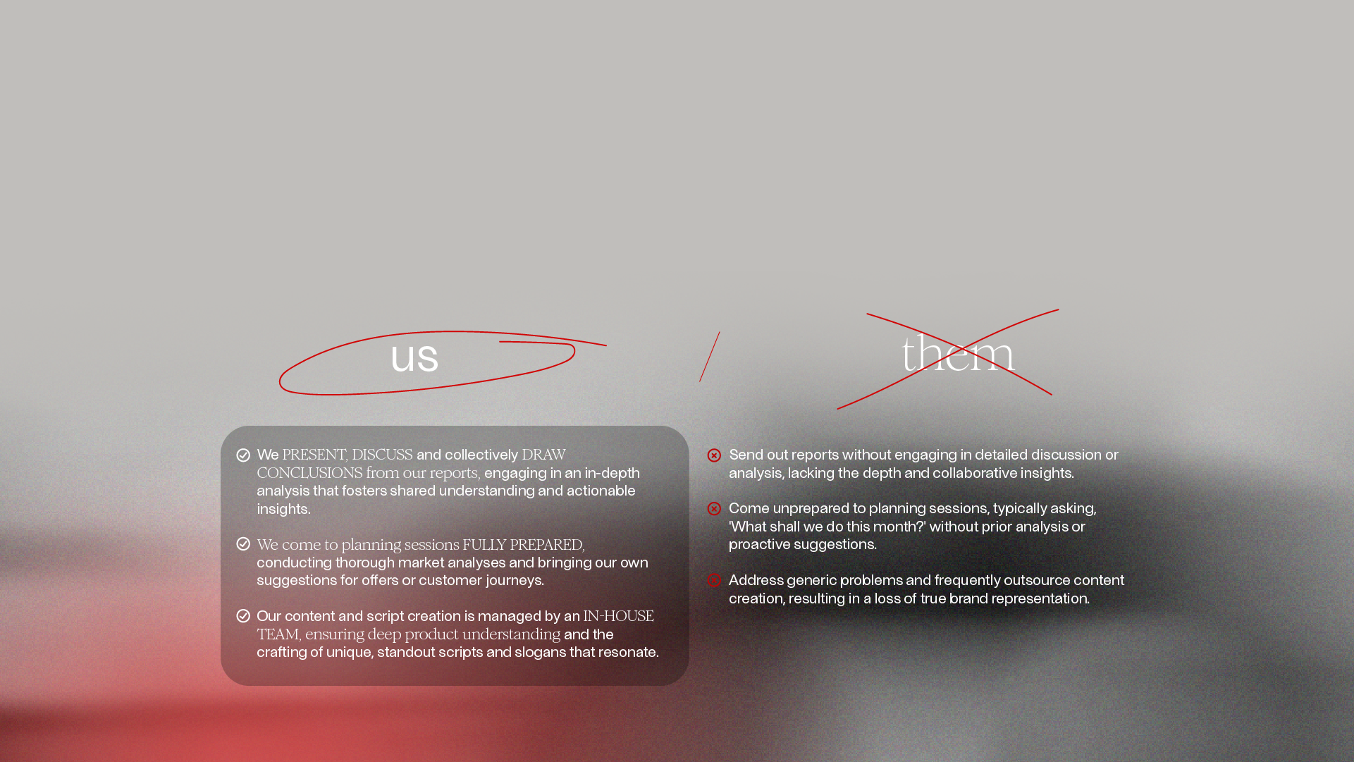 Collective force of strategic minds, project managers, media buyers, content creators, copywriters, and visionary graphic designers.